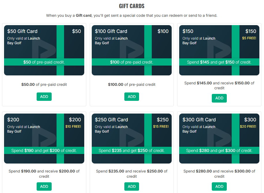 Gift cards for golf are a great option for anyone who enjoys the game—whether they’re a seasoned golfer or just starting out. The flexibility of a gift card makes it easy for the recipient to spend it on what they value most. The game of golf. Whether someone is new to the sport or plays regularly, a golf gift card to Launch Bay Golf just fits. Beginners might use it for range time, while experienced players might like to play at new courses from around the world. Golf is a relaxing, social, and healthy activity. Giving a golf gift card supports someone’s hobby while encouraging physical activity. A gift card lets them choose exactly what they want—without you needing to guess the right brand, size, or style. Golf gift cards are a thoughtful, easy, and flexible way to support someone’s passion for golf—letting them play and practice on their own terms.
